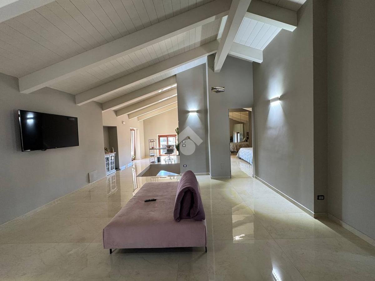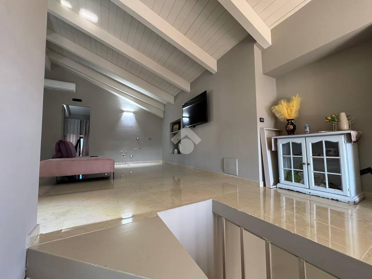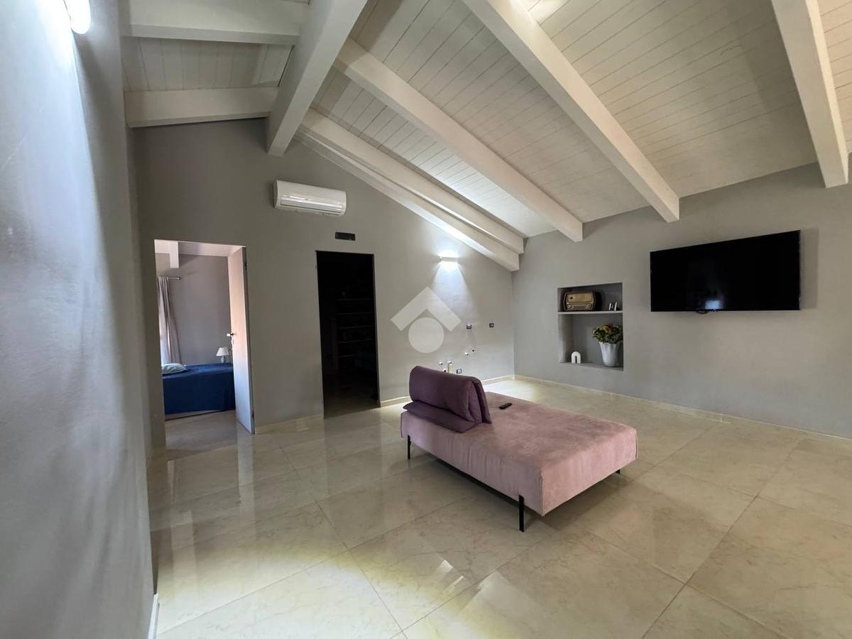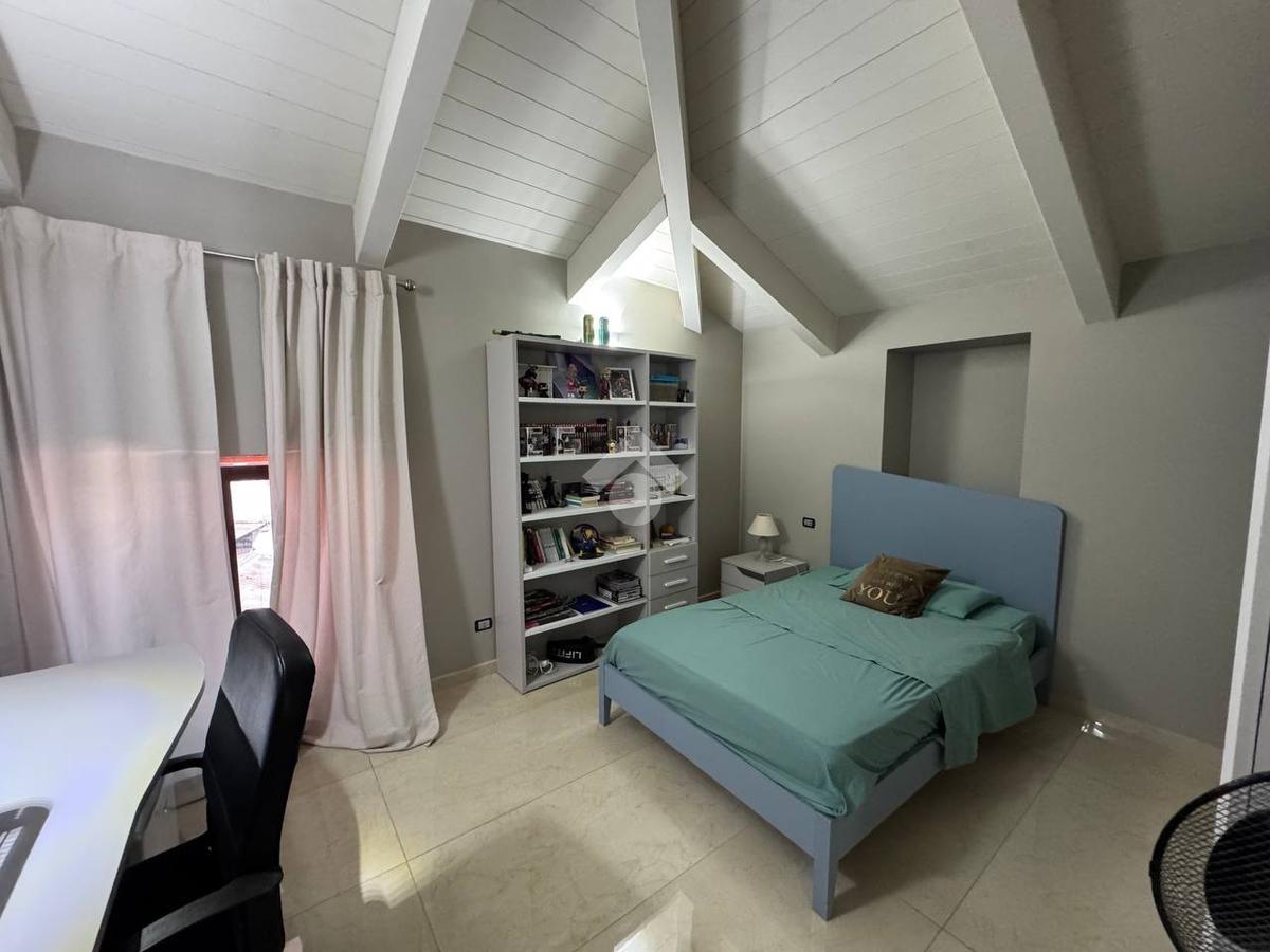 Salendo al livello superiore, troviamo una zona living riservata e raccolta, perfetta per momenti di relax o intrattenimento. A completare il piano, tre camere da letto, di cui una suite padronale con cabina armadio e bagno privato, e un ulteriore bagno per le camerette.